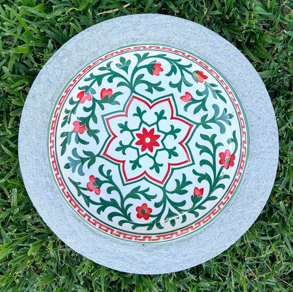 26cm bird bath with beautiful green and splashes of red.